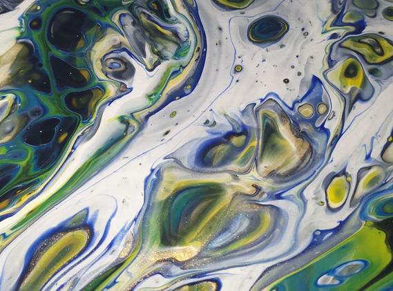 As the title suggests, this piece evokes a squeezing of the upper and lower parts of the picture into the very fine strata that form the centre horizontal. There’s a lot of nice fine structure in a limited palette of green, blue, yellow, black and white. There is a lot of metallic gold featured.