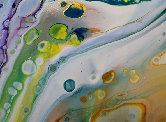 A beautiful and subtle melange of stratified colours. Includes some very nice gold lacing, particularly around the turquoise cells. Looks great in the gold frame.